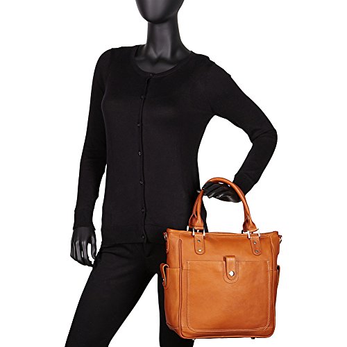 Details: Top zip-opening to main compartment with a padded tablet pocket and interior zip-pocket. Front open pocket with magnetic strap closure. Two side open pockets with magnetic strap closure. Rear vertical zip-pocket. Double padded handles and an adjustable/detachable shoulder strap.