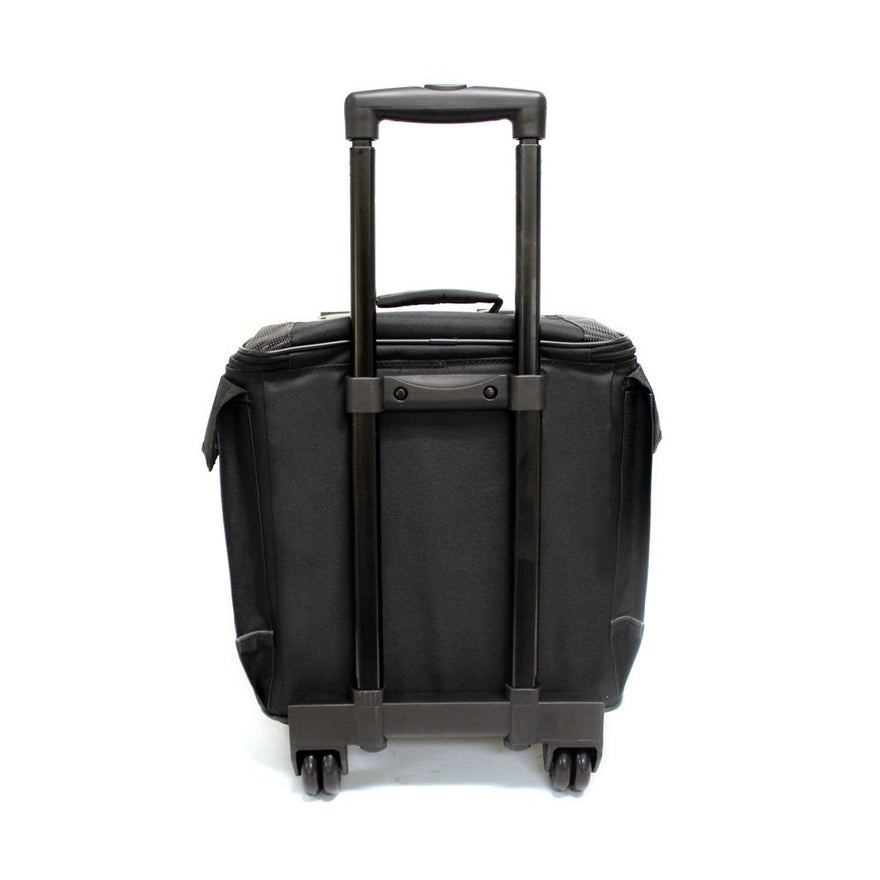Details: Made of 600D polyester, this unique wheeled case features 12 separate sections, 6 permanent and 6 detachable, allowing it to securely hold bottles in place. The 6 detachable sections are designed to accommodate bottles of various sizes or to be used as a regular cooler. Completely foam padded around the case & sections. Other features include a front organizer to hold a PDA, calculator, cards pens, and incidentals, and dual side pockets for catalogs and memo pads. The soft-grip handle,locking pull-up handle and skate wheels make this convenient case pleasure to pull. The perfect piece of a beverage representative!