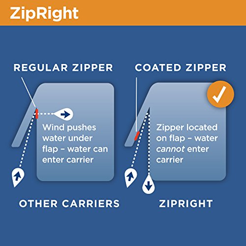 Details: The Right line Gear Sport 3 Car Top Carrier is 100% waterproof and attaches to vehicles WITH or WITHOUT a roof rack. Attach the carrier's straps to a vehicle’s roof rack or use the Car Clips to attach the straps to a vehicle's door frame weather molding. The carrier is made from UV protected PVC Semi-Coated Mesh XT and Hydro tuff for maximum durability. The materials are sewn together for strength and then welded along the stitching to make the seam waterproof. The carrier’s Zip Right System locates a urethane coated zipper on the protective zipper flap where water cannot enter. The Sport 3 is one of the largest car top bags on the market and aerodynamically designed to save $$$ at the gas pump.