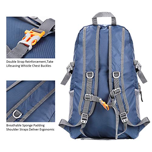 - 【INGENUITY DESIGN】Designed for comfortable all-day carrying with our breathable mesh padded shoulder straps and a web haul handle. The shoulder straps is adjustable. We consider the safety of travel, so we made an adjustable chest strap with a whistle buckle help you lock your backpack in place secure and send a message for help, let your trip feel more at ease. Our hiking daypack with 3m reflective strips, you will be safe and seen while hikes or walking at night or during bad weather.