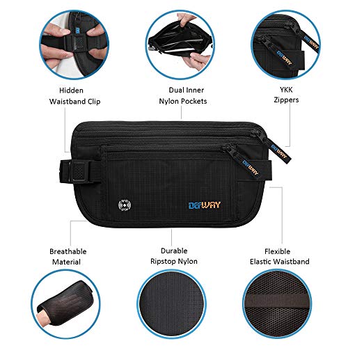 • COMPACT STORAGE&QUALITY GUARANTEE: Defway passport belt is spacious enough to hold all travel necessities. Two zippered front compartments, mesh pockets inside and back pocket provide large storage capacity for you to easily organize all your valuables, including passports(can fit multiple US passports), smart phone, airline tickets, cash, medication, room key, earphones and so on. You can buy with confidence because our money belts for travel women offers 1 year quality assurance.