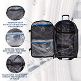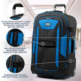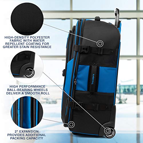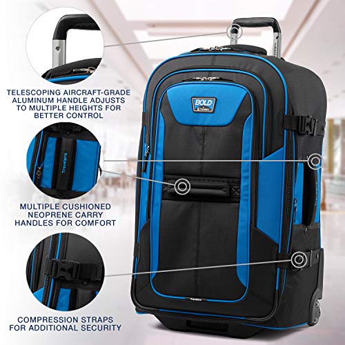 Details: The 28" Expandable Rollaboard is part of the Travelpro BOLD™ Collection. Stay neat and organized as you travel the globe, with the BOLD by Travelpro 28" Expandable Rollaboard. Made with rugged high-density polyester fabric and a water repellent coating. Retractable, telescoping handle. Top and side padded handles for easy lifting. Front zip pocket for quick-access items such as phones, cords, and snacks. Padded pocket allows quick access to your tablet without opening the main compartment. Six exterior slip pockets. One exterior credit card slot. Hidden back pocket ideal for quick access to change, keys, electronic cables, phone and more. Interior opens book-style to reveal a mesh zip compartment and wet pocket. Three interior slip pockets. Interior adjustable compression straps with Duraflex buckles. Ball-bearing wheels creates a smooth ride on any surface.