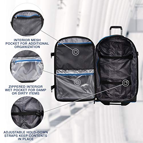 - Protective reinforced wheel housings, skid guards and molded corner guards protect high wear points. Compression straps for additional security have rubberized buckles for comfort. Interior mesh pocket is built into the lid.