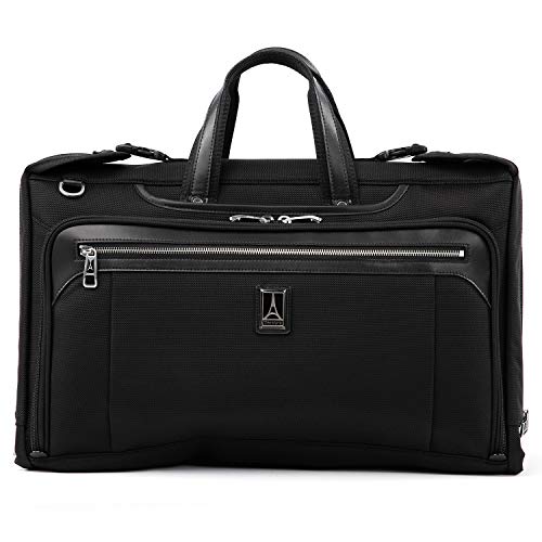 Details: Compact, convenient, creaseless! The Travelpro Platinum Elite Tri-Fold Carry-On Garment Bag is the perfect grab-and-go garment bag for quick trips, keeping suits, shirts and dresses protected and crumple-free. Luxury styling includes premium fabrics with leather trim and chrome zippers along with padded interior roll bars to protect clothes from wrinkles. Multiple interior pockets accommodate folded clothing, accessories and more with excellent packing capacity, while a removable, quart-size wet pocket is TSA compliant and perfect for toiletries. Large exterior pocket gives you quick access to a tablet and our Travelpro QuickSlip front pocket with magnetic closure keeps essentials like cell phone stored while going through security. Backed by our Built for a Lifetime Limited Worry Free Warranty.