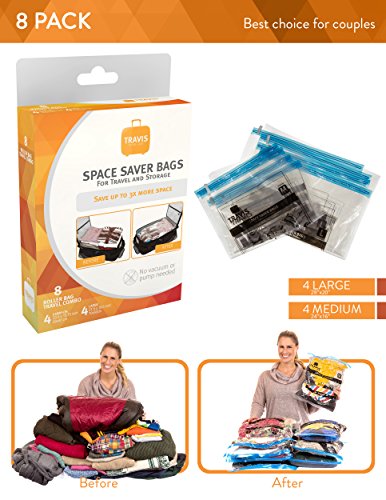 Details: Space Bags are the most versatile and underrated travel accessory you could carry. They are simple to use. Simply pack, close and roll; you will NOT need a vacuum to suck the air out as the air exits as you roll the bag. It won't just compress your clothes so you can fit up to 300% more, you can also use them to organize your load and keep things tidy. CONTENTS: 4 MEDIUM bags suitable for carry on luggage (23.5'' x 15.75'') that around 2 sweaters, one pillow, one large jacket or 2 pairs of pants; and 4 LARGE bags perfect for larger suitcases (27.5'' x 19.6'') that hold 4 Sweaters, two pillows, 2large jackets or 3 pairs of pants. We strive for your total satisfaction backed by a 100% money back guaranty, so what are you waiting for? scroll to the top and add to cart.