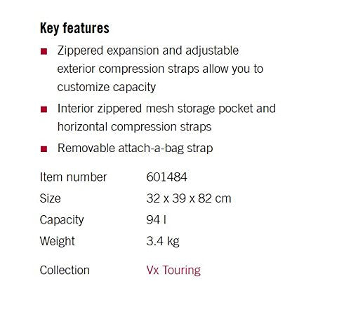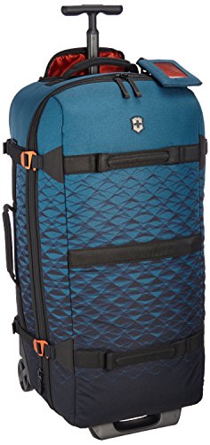 Details: Designed for adventure, this spacious wheeled duffel is lightweight and full of function One-touch, monopole handle system with ergonomic comfort grip locks into three different positions - 94 cm (37"), 99 cm (39") and 104 cm (41") - to accommodate travelers of various heights and zips away when not in use. Compact design of the monopole handle allows for maximum utilization of interior packing space. Inline wheels for a smooth and stable roll. Spacious main compartment with large U-shaped opening expands 3 cm (1.1") for additional capacity. Interior organization includes Y-shaped webbing compression straps, a large zippered mesh lid pocket and a zippered mesh side pocket containing a key fob and storage slots. Exterior organization includes a padded front compartment, a zippered quick-access side pocket and two rear, easy-to-clean, wet/dry pockets ideal for storing running shoes or dirty clothes. Adjustable side compression straps with durable Hypalon attachments cinch to stabilize heavy loads. Rear skid plates provide protection to areas most prone to abrasion. Removable attach-a-bag strap secures an additional bag to the front of the duffel and holds up to 13.6 kg (30 lbs). Top and side haul handles and bottom grab slot for easy carrying. Lockable zippers with Hypalon pulls. Removable luggage tag. Travel Sentry Approved combination lock secures belongings and allows airport security screeners to open the lock without destroying it and relock it after inspection. Access Lock Combination Recovery Program allows you to register your lock combination on victorinox.com and recover it if it is ever forgotten. 6.9 lbs / 3.13 kg. 4211 cu in / 69 l (expands to 4394 cu in / 72 l)