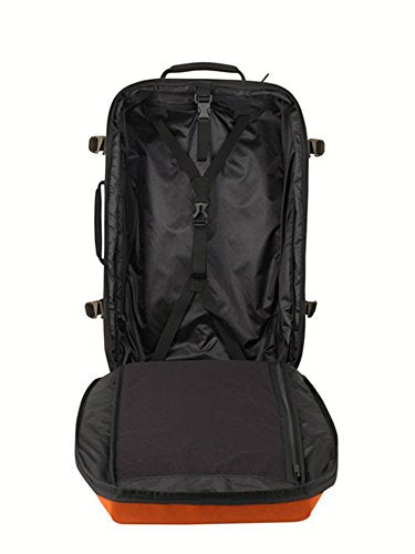 - Interior organization includes Y-shaped webbing compression straps, a large zippered mesh lid pocket and a zippered mesh side pocket containing a key fob and storage slots