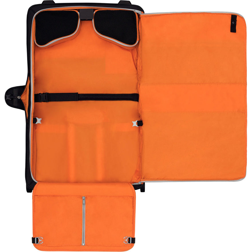 Convenient, wheeled garment carrier lays flat for easy packing and keeps clothing wrinkle-free during travel.