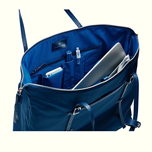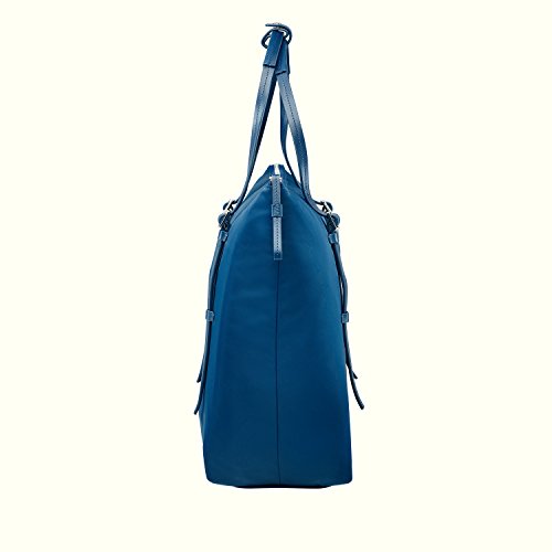 Details: Elegant silhouette and spacious interior make the Charisma a true carry-all bag ideal for work, weekends and stylish travel. Top zip closure. Dedicated 15.6" (40 cm) padded laptop compartment and zippered tablet / eReader pocket. Organizational panel contains smartphone pocket, two pen loops large enough to hold writing utensils or a tube of lip gloss and micro-suede zippered valuables pocket great for jewelry, but also perfectly sized for a pair of sunglasses. Front zippered pocket for small items. Rear pocket with magnetic closure converts to a sleeve to conveniently slide over the handle system of wheeled luggage. Metal feet protect the bottom of the bag. Adjustable leather shoulder straps. Elegant silver hardware and leather touch points. Comes with removable key pouch