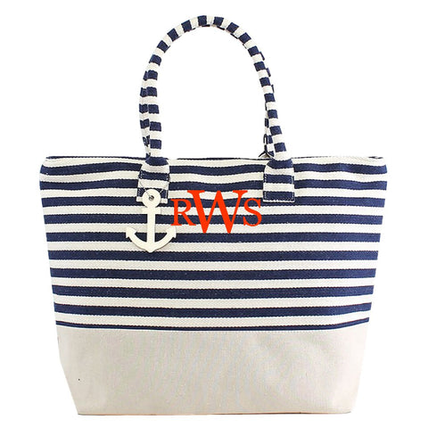 Navy Monogrammed Large Zipper Top Stripe Canvas Look Beach Bag Tote