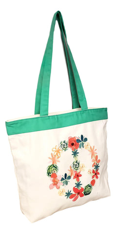 Floral Peace Sign Eco Friendly Beach or Carry All Shopping Zipper Top Tote Bag