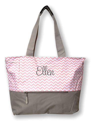 XL Beach Tote Chevron Print Weekender Bag with Mesh Webbed Handles and Outer Zippered PocketCan Be Personalized (Personalized, Pastel Pink)