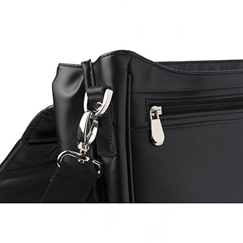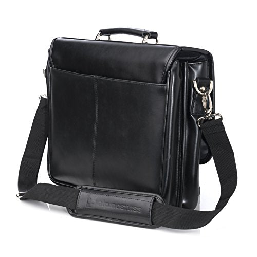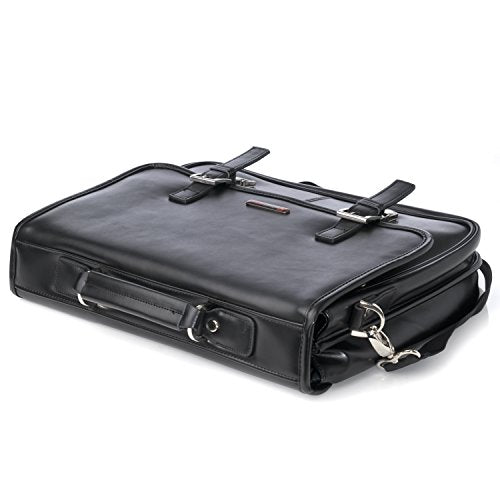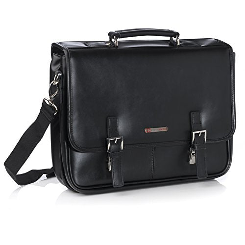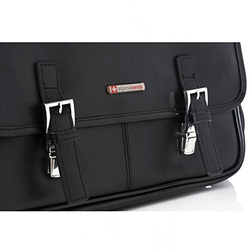 Details: Hunter Leather Messenger Briefcase By Alpine Swiss MSRP $260.00 The Hunter flap-over double buckle leather briefcase is a professional dressy briefcase with many features in a compact double gusset semi structured frame. Product Features: Genuine Leather Measurements: 16" L x 14" H x 4.5" W Professional, Fashionable, Functional Front flapover design Reinforced carrying top handle and Decorative buckles and tuck clasp closure Elegant silver hardware Fully lined interior Divided main section: Front gusset features organizer with phone pouch, 2 pen loops, 3 card slots Back gusset with full length zipper pocket measuring 14.5" L x 10.5" H x 2" W Horizontal zipper pocket under front flap Back outside slip pocket Removable and adjustable shoulder strap One year manufacturer's warranty