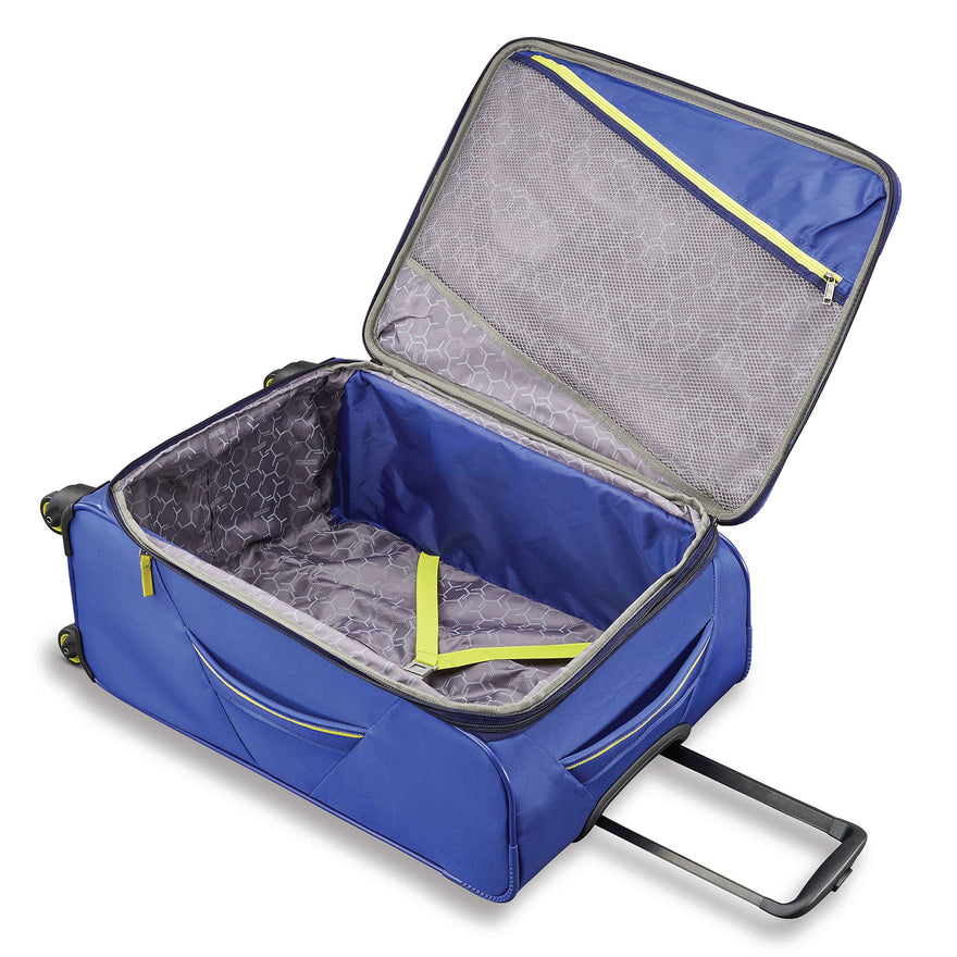 Details: The sonic lightweight carry on spinner suitcase weights in at just 7 pounds, and is easy to pack. The large interior compartment and exterior packing pockets offer plenty of room for everything you need for a 2-3 day adventure. Meeting most airline requirements for carry on sizing, the sonic spinner suitcase makes travel a breeze with its ease of mobility and compact yet roomy style. Single airflow spinner wheels for smooth ride expands 1. 5" Easy grip soft molded kissing zipper pulls integrated top, side and bottom carry handles for easy lifting push button locking handle large interior packing compartment blouse pocket on door panel interior modesty pocket color pop cross straps carry-on size and weight allowances vary by airline. Go to airline carry-on guide for more details. If the bag is overstuffed, it may not be accepted by the airlines. Weight: 7. 1 lbs. Body Dimensions: 20. 25" X 14. 0" X 8. Overall Dimensions: 23. 0" X 14. 2" X 11. 0".