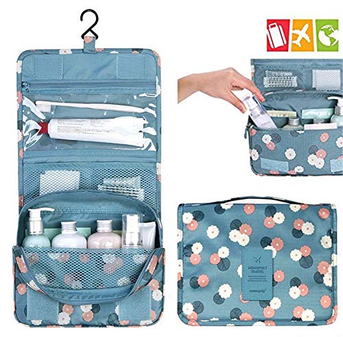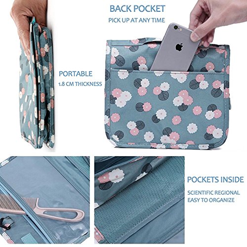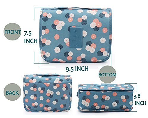 Details: Portable Travel Makeup Cosmetic Bag - Waterproof Travel Hanging Organizer Bag for Women Girls, Blue Flowers