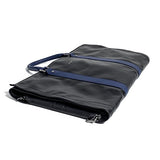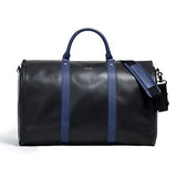 Details: Inspired by minimalist and modern design. We have developed a fresh perspective on our classic Garment Weekender Bag that blends both unparalleled craftsmanship, high-quality materials, and exceptional practicality. The new smooth top-grain black leather paired with colored accents will elevate any modern outfit. SIZE: 22" x 13" x 9" WEIGHT: 4.25 lbs INTERIOR Fully unzipped, the garment section can easily accommodate two suits (up to a size 46R). Once the duffle is reconstructed, the main compartment houses two zip accessory compartments and two shoe pockets (up to a size 14 shoe). EXTERIOR The shell is made of top-grain flat leather. Removing the front two pockets give this a completely modern finish. In limited quantities, featuring 2 colored accents for a distinct look. A sliding shoulder strap makes carrying the bag comfortable and functional. STORAGE Fully unzipped, the bag folds flat to 2.5" in height, making storage in the tightest of places a breeze.