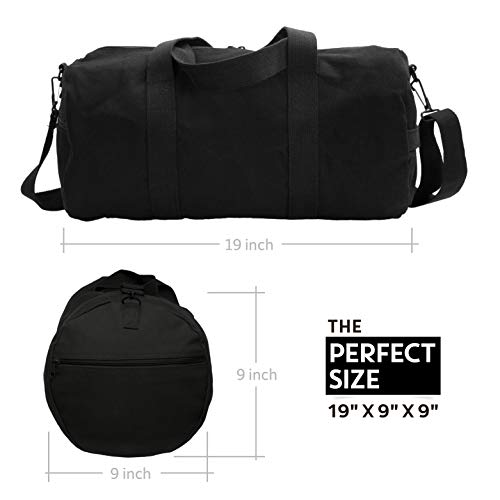 Versatile canvas duffel bag. It has a heavyweight cotton canvas pocket, adjustable shoulder strap, and web carry handles. The medium measures 19" by 9," while the large measures 24" by 12". It has an enormous main compartment that can fit your weekend's worth of goodies, or daily activities. It is great for school, work, traveling light, and many more.