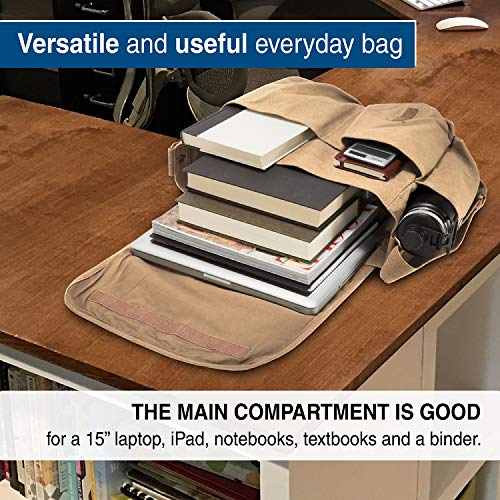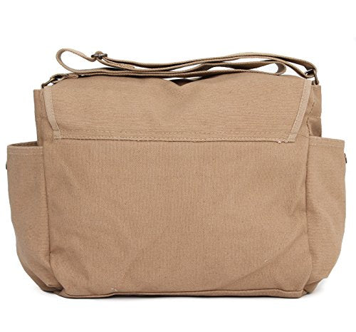 Versatile canvas messenger bag. It has an enormous main compartment that can fit laptops, files, paper folders, clothing and water bottles. There is an inside zipper pouch for car keys and wallets. The bag has two outside and two inside pockets for anything that is needed for your travels or daily activities. It is great for school, work, traveling light, and many more. It is made of 100% cotton, and the canvas has brass hardware to create a very managable structure. 2" wide adjustable shoulder strap with Brass hardware. Bag Dimensions: 15"x11"x6".