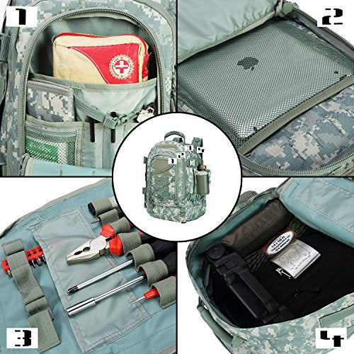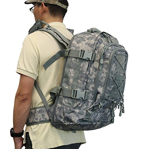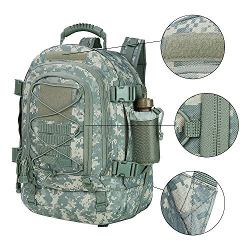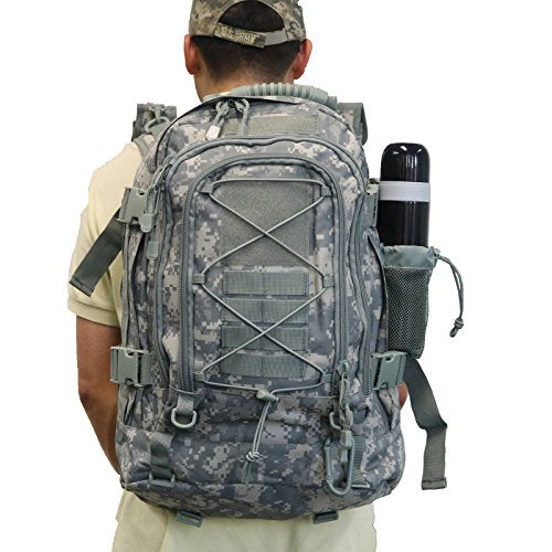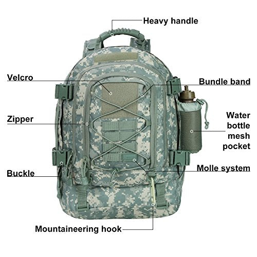 Details: Expandable Tactical Backpack is constructed by high quality 600 Denier material, heavy duty over-sized zippers and tabs. Expandable main compartment with multiple gear pouches and molle compatibility that allows customizing the pack for your needs. Hydration compartment accepts up to 3 liter bladder ( not included). Main compartment is 19"x13" and expands from 5" to 10" to accommodate extra vital assault gear to complete your mission. Hydration bladder compatible (bladder not included).