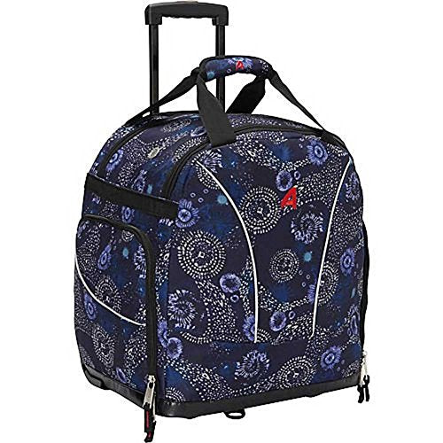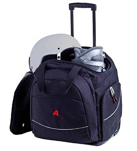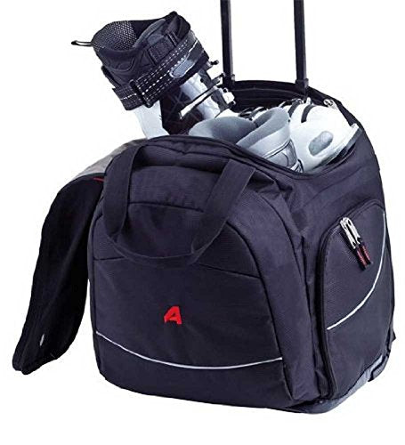 Details: Athalon Wheeling Boot Bag Carryon Size, Choose your Color. 340. Athalon Snowsport products offer a high quality line of boot bags and ski bags for a very sophisticated and discerning snowsport enthusiast. The quality is "as good as it gets". The bags are well thought out and there are pieces available for men, women, or basically anyone in the family. The collection includes everything from single/double padded and unpadded ski bags, boot bags, ski/bootbag combos, and wheeling ski bags. In other words, everything the traveling skier needs to make their trip complete. Made of high density, water resistant, rugged polyester. Dedsigned to fit in commerical airlines over head bins. It is easy to push or pull. Large "U" shaped opening makes it easy to pack. Pull out telscoping handle that locks into place. Hide away paddded backpack straps. Sealed ball bearing in line skate wheels for easy handling. Extra large zipper pulls with web make it easy to access your gear while wearing gloves. Center compartment for helmet and accessories. Top carry handles with comfort grip wrap. Side accessory organizer pockets with "coal shoot gussets: prevent the pockets from falling open. Deluxe extra padded back with lumbar supports. Interior section is fully lined and padded. Product Dimensions: 10.5" x 14" x 16"; 6 lbs.