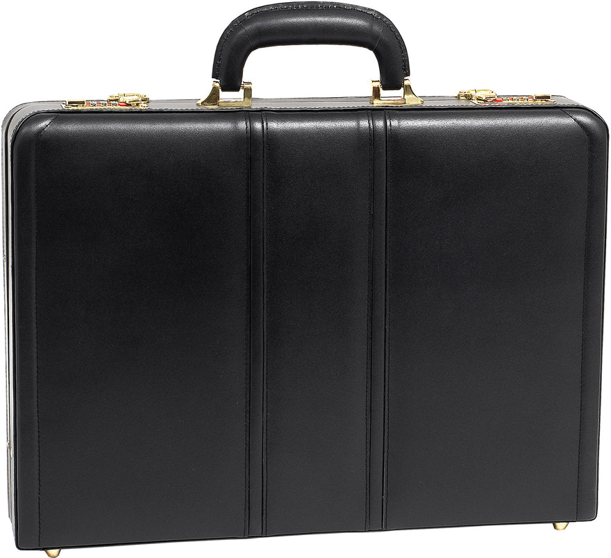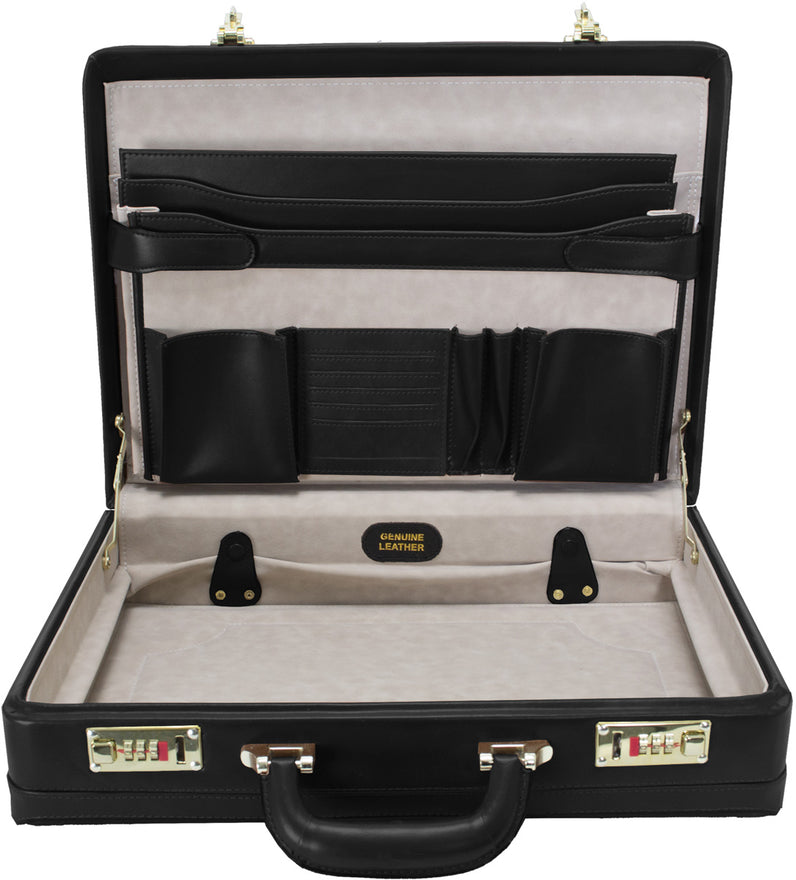 Slim design. 3-digit combination lock for added security. Gold-finished hardware. Comfortable top carry handle. Protective feet keeps case from falling over. Easily accessible compartment opens and stays upright at 90 degrees. Main access compartment provides storage space for files. Interior includes an organizer section that holds business cards, cell phones, pens, notepads and calculators. Adjustable 3-file organizer for files. Suede interior padding.