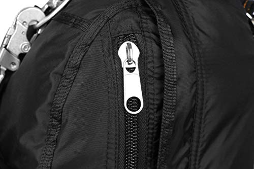 • Multiple zippered pockets, Dual-zip main opening unzips for easy access, Side zip for concealment.