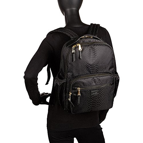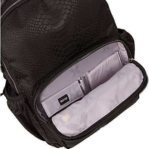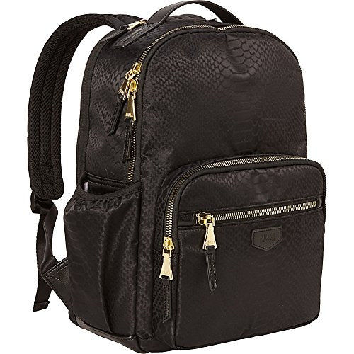 Details: Stroll in fashion-forward style with this Aimee Kortenberg python printed jacquard polyester dual compartment 15" Women's laptop business backpack with anti-theft RFID protection. Boasts anti-theft RFID protected pockets to help Protect against credit card theft, along with a stylish printed interior lining and plenty of organized packing room for all your travel essentials. A stylish tech savvy women's designer laptop backpack that's perfect for travelers whom value both style and function. Overall Dimensions: 16" H x 12" L x 6" D. Weight: 1.4 lbs. Backed by manufacturer 10 year limited warranty