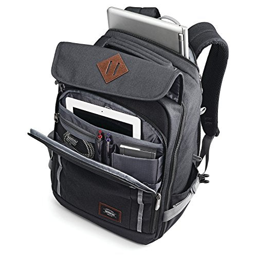 Details: This American Tourister backpack is made of ultra-lightweight 600d shiny polyester construction. It features a custom American Tourister hardware; zipper pulls, rivets, and patches. The s-curve padded shoulder straps with air channel back with lumbar support.