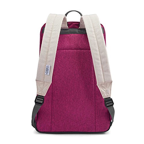 Details: • 600D Shiny Poly & 600D Two tone• Zippers are metal, plastic teeth, and nylon coil• Organizational Pocket• Dedicated laptop sleeve that can hold up to a 15.6"• Tablet sleeve• Webbing loop detail accent• Custom American Tourister hardware; zipper pulls, rivets, and patches• Water bottle pocket• Padded shoulder straps.• Weight: 1.1 lbs.Body Dimensions: 17.7" x 11.8" x 5.9"