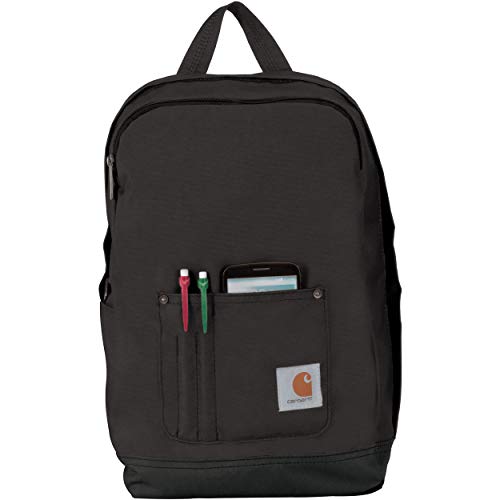 Details: Good things do come in more compact packages with the Carhartt Legacy Compact Tablet Backpack. This backpack, made from rugged poly with Rain Defender durable water repellent, is big enough to carry a tablet and some essentials but small and rugged enough to take anywhere. A large main compartment has a dedicated pocket for a tablet (measures 9.5 x 10.25 inches, and can hold a tablet as tall as 12 inches). The front zippered pocket is perfect for holding smaller items such as keys and cell phone, while the side slash pocket is perfect for a bottle of water. The front bib pocket features a Carhartt logo patch, and is a great place to store some pens and other essentials. Comfort padded shoulder straps ensure that this pack feels great when being carried. The Carhartt Legacy Compact Tablet Backpack measures 10.5w x 15.5h x 3.5d inches, weighs 1 pound, and features YKK zippers, Carhartt Work Bags, Packs & Gear are covered by a limited warranty against manufacturing defects in materials and workmanship for the normal life of the product.