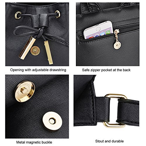 - Coofit Brand Backpack: Material updated to good quality PU leather. It's a beautiful and simplistic design leather drawstring closure backpack and come with a cute black keychain.