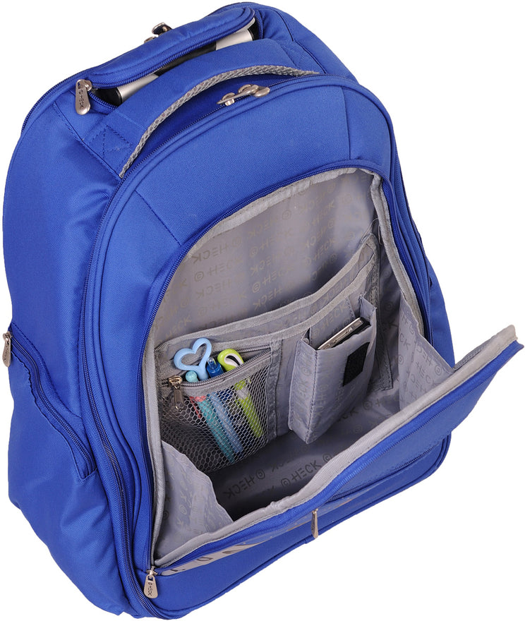 - Ed Heck backpack flaunts his unique pop art and features telescoping handle, skate wheels and concealed shoulder strap.