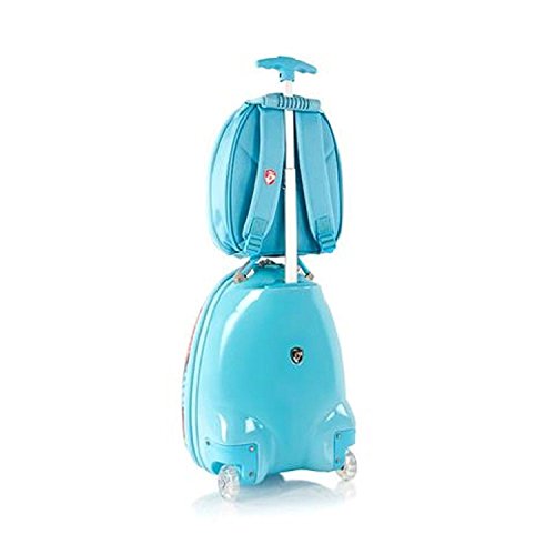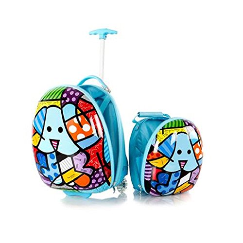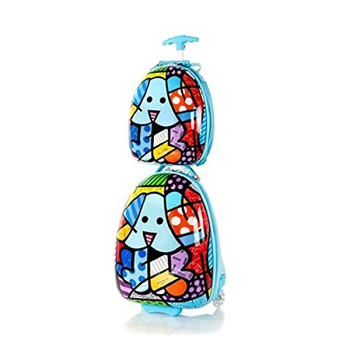 Details: Britto for Kids - Luggage and Backpack Set - Blue Dog Britto's Kids Luggage and Backpack 2PC set are part of a Limited Edition Series of luggage. Born in Brazil, Romero Britto is a Florida-based neo-pop artist, painter, serigrapher, and sculptor. Combining elements of pop art and graffiti painting, Britto's signature style is recognized worldwide. Britto's Kids Luggage and Backpack 2PC set are sure to turn heads with their fun and colourful designs. The vibrant luggage prints are protected by a layer of clear coat which also gives them a beautiful glossy shine. The Britto's Kids Luggage and Backpack 2PC set are designed to incorporated several children-specific features. One of these is the internal 'reversed-curved' handle system that curves the handle inwards & upwards closer to the child, making it much more comfortable for the child - at a low height - to hold and navigate the case. The Patent Protected design of this case also allows the wheels to 'protrude' out. This protrusion keeps the case elevated, so that even when being rolled at a very low height off the floor, the wheels will be the only point of contact and the case will continue to roll with ease. The cases weigh in at a mere 3.2 lbs, and feature our inline skate wheels that make their rolling even smoother, so any child can easily wheel these fun cases around. They also have a zipper closure system, that when opened reveals a beautifully lined interior as well as a zippered divider for internal organization.