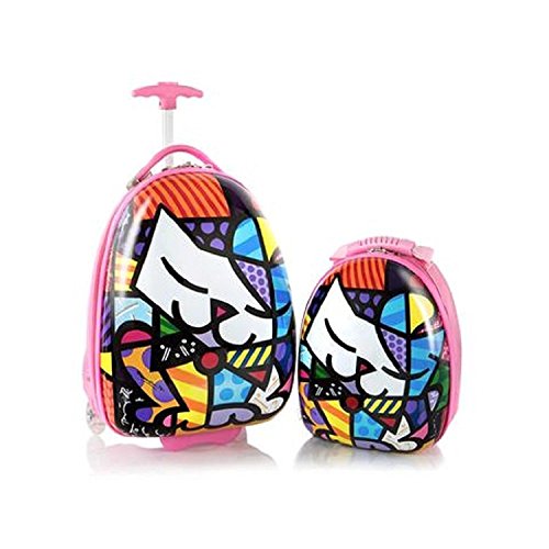 Details: Britto for Kids - Luggage and Backpack Set - Kitty Britto's Kids Luggage and Backpack 2PC set are part of a Limited Edition Series of luggage. Born in Brazil, Romero Britto is a Florida-based neo-pop artist, painter, serigrapher, and sculptor. Combining elements of pop art and graffiti painting, Britto's signature style is recognized worldwide. Britto's Kids Luggage and Backpack 2PC set are sure to turn heads with their fun and colourful designs. The vibrant luggage prints are protected by a layer of clear coat which also gives them a beautiful glossy shine. The Britto's Kids Luggage and Backpack 2PC set are designed to incorporated several children-specific features. One of these is the internal 'reversed-curved' handle system that curves the handle inwards & upwards closer to the child, making it much more comfortable for the child - at a low height - to hold and navigate the case. The Patent Protected design of this case also allows the wheels to 'protrude' out. This protrusion keeps the case elevated, so that even when being rolled at a very low height off the floor, the wheels will be the only point of contact and the case will continue to roll with ease. The cases weigh in at a mere 3.2 lbs, and feature our inline skate wheels that make their rolling even smoother, so any child can easily wheel these fun cases around. They also have a zipper closure system, that when opened reveals a beautifully lined interior as well as a zippered divider for internal organization.