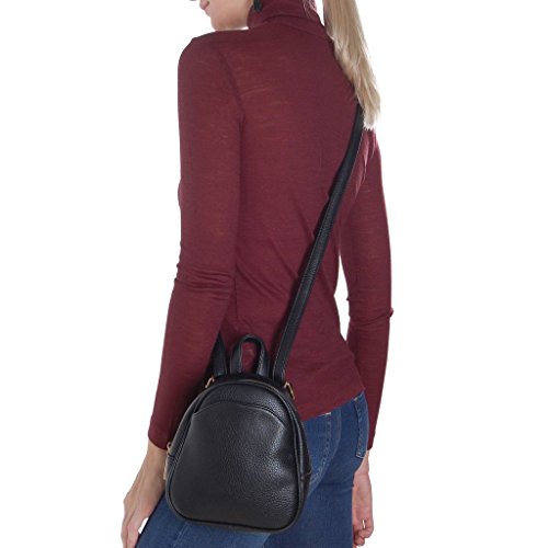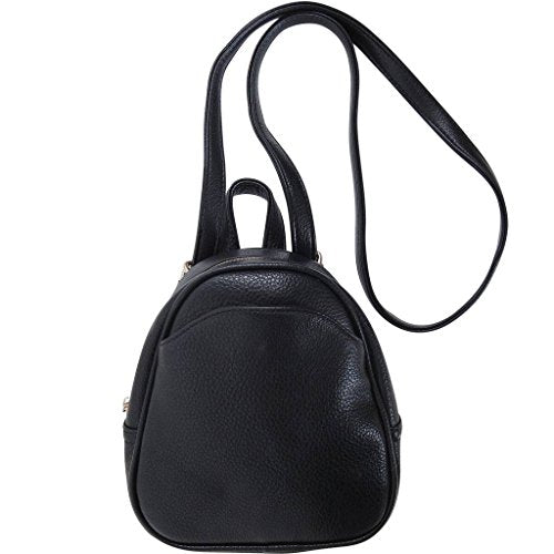 Details: Take it back to the classics with this super compact mini backpack featuring a luxuriously smooth exterior made from softly pebbled vegan leather. The perfect size purse to hold all of your day-to-night essentials, this small shoulder bag features a lightly structured interior with enough room for your cell-phone, a thin wallet, keys, a small e-Reader tablet, and makeup staples. It is constructed in a minimalist shape with long, adjustable shoulder straps that can be converted for multiple carrying options. Wear it with two straps as a back-pack, or adjust it into a one-strap messenger bag, cross-body pocketbook, sling rucksack bag, or tiny shoulder handbag. Lightweight and sleek, this vegan leather backpack purse is perfect for a festival, concert, or off-duty days. Finished with a rounded top-zip closure, fabric lined interior, single top handle, gold-tone hardware, and a front exterior pocket with magnetic closure. Dimensions: 8" x 7" x 3.5".