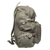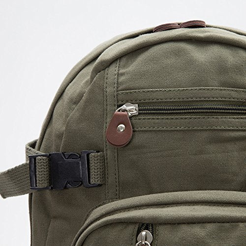 Versatile vintage canvas backpack. The bag has a main compartment that easily holds notebooks, supplies, books, and all your other daily necessities. The small size backpack can hold a 12-inch laptop, while the large size backpack can hold a 15-inch laptop. This bag features washed cotton canvas material, padded shoulder straps, 3 front zippered pouches, one main compartment, 2 side pockets with elastic and tie-down straps, and a top carry handle.