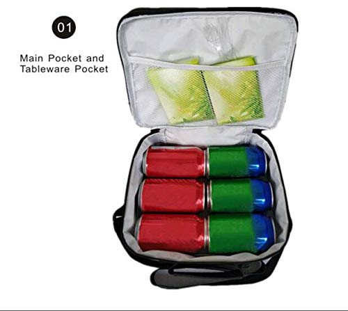- Lunch bag size: 10.6"L x 4.7"W x 8.2"H. Oxford fabric, EVA+PE cotton lining,have a main pocket used as cooler/warm bags, max stores 6 cans of 355ml cola.Nicely accommodates stacked food storage containers and water bottles. The interior mesh pocket is great for holding knives, forks and spoons. Also has a front zipper pocket to keep loose items.Important Note:Drinks and tissues not included.