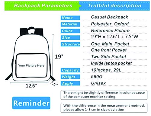 - Backpack Size: 19"Hx12.6"Lx7.5"W. 1*zipper pocket on the front for tablet(11 inch),2*side pockets for waterbottle or personal items,1*main compartment for school books,laptop(less than 19 inch)Padded back and adjustable shoulder straps give support and keep you cool.Polyester&oxford fabric, lightweight, durable.