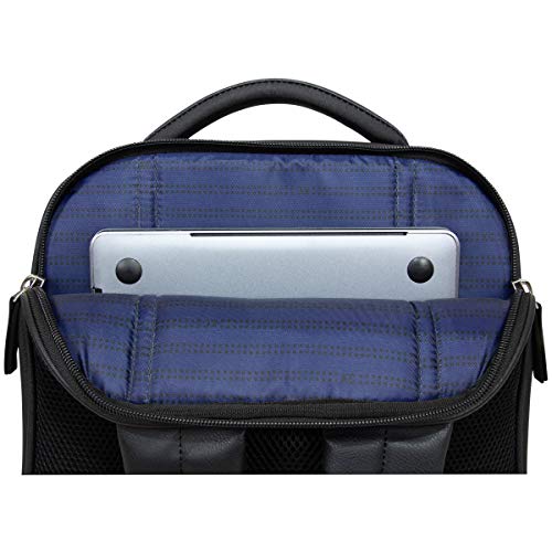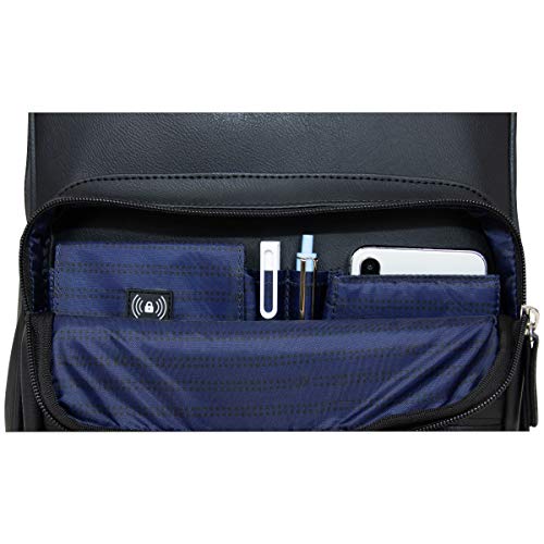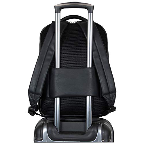 Details: If you’re searching for a faux leather, double compartment, 15.6” laptop backpack to store all your business and travel necessities, you’re on the right track. Kenneth Cole Reaction’s “On Track Pack” is the solution to all your packing needs. This backpack is crafted from high quality materials, including a durable, grainy faux leather exterior with a tear-resistant, fully lined interior and premium, self-repairing zippers for long-lasting use. Its fully-lined, main compartment interior features a mesh zipper pocket, dual open slip pockets, and plenty of space to store your belongings, as well as a fully padded rear compartment to securely hold most laptops with up to a 15.6-inch screen. TECHNI-COLE RFID: Anti-theft radio frequency identification (RFID) blocking technology in organizer pockets lined with thin shielding fabric to help block radio waves from being transmitted from U. S. passports and certain credit/debit cards. A front zipper pocket includes an RFID protected flapover pocket, a gusseted open accessory pocket, and two pen holders. Additional elastic pockets on both sides provide extra space to hold a water bottle or other small items you need on hand. The padded top handle has a 1.5-inch handle drop for comfortable carrying, as well as a padded air-mesh back panel with padded, adjustable shoulder straps. A trolley tunnel on the rear exterior is made to fit over most retractable trolley handles for another convenient, hands-free carrying option. Overall Dimensions: 16” L x 12” H x 5.5” D. Laptop Compartment Dimensions: 10.5” L x 15.25” H x 1” D. Weight: 2.3 lbs. A stylish, faux leather backpack for the professional on the go.