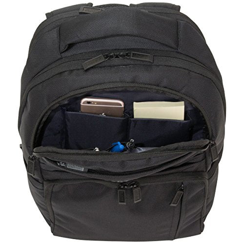 Details: 1680d polyester dual compartment 15.6" computer backpack. Rfid blocking technology offers protection in organizer pockets. Fits most laptops with up to 15.6" screens. Compatible with most tablets. Durable, 1680d polyester exterior with fully lined interior. Front exterior includes a vertical zipper pocket, a hidden zippered padded tablet pocket, and an upper hidden zipper pocket lined with soft brushed polyester to hold and protect valuables, such as sunglasses. Front exterior also features an upper u-shaped zip down pocket including two open accessory pockets with multiple elastic accessory loops and a lower rfid protected u-shaped zip down pocket consisting of multiple organizer pockets to hold a variety of business essentials. Roomy main compartment includes a zippered mesh accessory pocket with plenty of room to hold other needed items. Rear compartment is padded to hold and protect laptop. Easy to grab top handle and dual side exterior zippered accessory / water bottle pockets featured. Padded air mesh back panel and shoulder straps with secure sternum strap and trolley tunnel made to fit over most luggage handles for hands free carrying. Overall size: 18.5" h x 12.5" w x 8.0" d. Computer compartment dimensions: 15.25" h x 10.5" w x 1.5" d