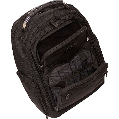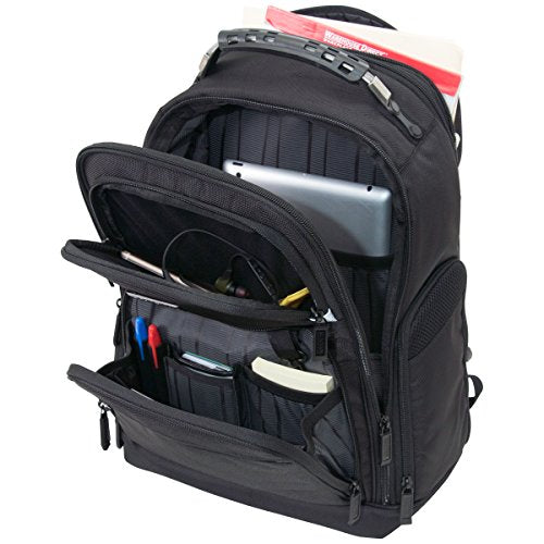 Details: 1680d polyester expandable dual compartment 17.0" computer backpack. Expands for greater carrying capacity. Fits most laptops with up to a 17.0" screen. Compatible with most tablets. Front exterior reflective zipper stops. 1680d polyester exterior with fully lined interior. Top zipper pocket on front of bag with reflective zipper stops is lined with soft brushed polyester made to hold and protect valuables. Front exterior also consists of a small easy access zipper pocket and a gusseted zip down pocket with an extensive, multi-pocket business organizer that includes a key fob. Roomy front compartment features full length elastic open top pocket, a padded tablet pocket, with plenty of room to hold any other needed belongings. Rear compartment is padded to hold laptop. Dual side exterior zip around, gusseted beverage / holster pockets. Durable, cable top handle with comfortable, molded grip. Rear exterior features a padded air-mesh back panel, adjustable shoulder straps with shock absorbent straps for ultimate comfort and trolley tunnel that fits over most luggage upright handles for hands-free carrying. Overall size: 18.0" h x 14.0" w x 8.0"- 9.5" d. Computer compartment size: 15.75" h x 11.0" w x 1.5" d