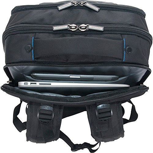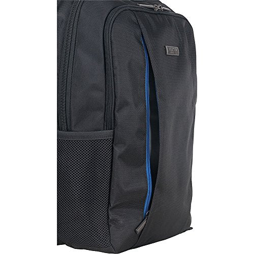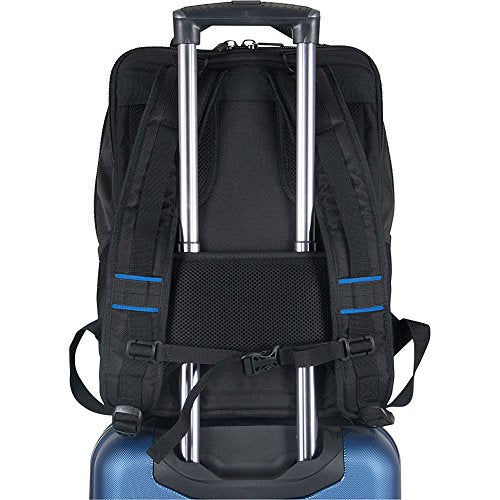 Details: Radio frequency identification (RFID) blocking technology helps to prevent electronic theft. Padded computer compartment fits most 15.6" laptops. Padded tablet pocket accommodates most tablets. Stylish, 1680d polyester exterior and a Tear-Resistant, fully lined interior with blue color pop. Front exterior features dual vertical zipper pockets and an RFID protected zip down gusseted pocket with an extensive organizer made to fit a variety of business essentials. Dual side exterior open elastic top mesh water bottle/ accessory pockets and padded, easy to grab top handle. Roomy front compartment includes a full-length zipper pocket, two open slip pockets, and a full length elastic open top pocket with plenty of room to hold other needed belongings. Rear compartment is fully padded to hold and protect your laptop and includes a padded tablet pocket. Rear exterior features a mesh back panel, a trolley Tunnel that fits over most luggage trolley handles for hands free carrying, and adjustable, padded shoulder straps with multiple accessory loops and sternum strap. Overall Dimensions: 17" h x 12" L x 7" D, laptop pocket Dimensions: 15.5" h x 10.5" L x 1.25" D, weight: 2.55 lbs, and includes a lifetime limited warranty.