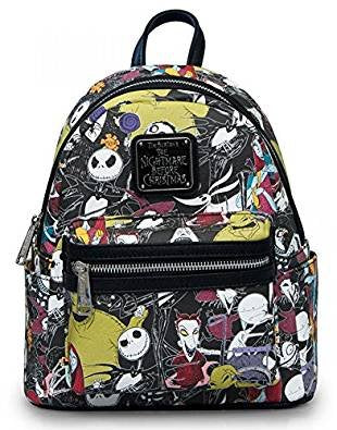 Details: Nightmare Before Christmas All Character Mini Backpack Black By Loungefly. Saffiano Faux Leather mini backpack with printed Nightmare Before Christmas Character details. A large zipper pocket is on the front along with a Loungefly label. The backpack has a sturdy strap at the top for hanging and a zipper closure. Measures: W: 9" X H: 10" X D: 4.5".
