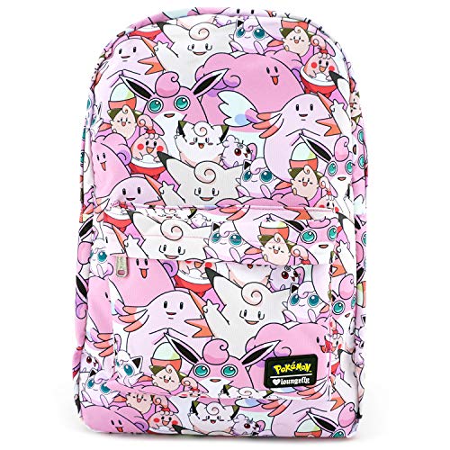 Details: Wide, double zipper main compartment opening. Laptop pocket. Roomy front exterior zipper pocket. Padded adjustable shoulder straps that can be extended to 30 inches. Rubber exterior Loungefly Pokemon label. Made of heavy woven nylon which makes it easy to wipe clean. Main compartment lined in grey and white pinstripes. Measures 18 inches tall, 12 inches wide, and 5 inches deep. Wide, double zipper main compartment opening. Laptop pocket. Roomy front exterior zipper pocket. Padded adjustable shoulder straps that can be extended to 30 inches. Made of heavy woven nylon which makes it easy to wipe clean. Main compartment lined in grey and white pinstripes. Measures 18 inches tall, 12 inches wide, and 5 inches deep. Loungefly pattern layout varies so each piece will not look identical. Cruelty free, man-made materials. Suitable for kids and adults.