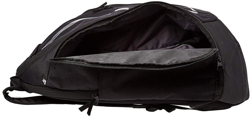 Details: STREAMLINE COMFORT AND STORAGE The Nike Hoops Elite Pro Basketball Backpack features multiple small-item pockets and a separate, ventilated compartment for your shoes. Its shoulder straps feature Pro Adapt technology for comfortable carrying to and from the gym. Benefits Large, zippered main compartment provides space for your gear Ventilated shoe compartment can hold up to a size 15 Nike Pro Adapt shoulder straps provide comfort Zippered foil-lined pocket offers space for your favorite beverage Haul loop at the top for an alternative carrying option Product Details Materials: 100% polyester Dimensions: 23" H X 13" W X 9" D Imported Color: White/Obsidian/Metallic Cool Grey Style: BA5554-100