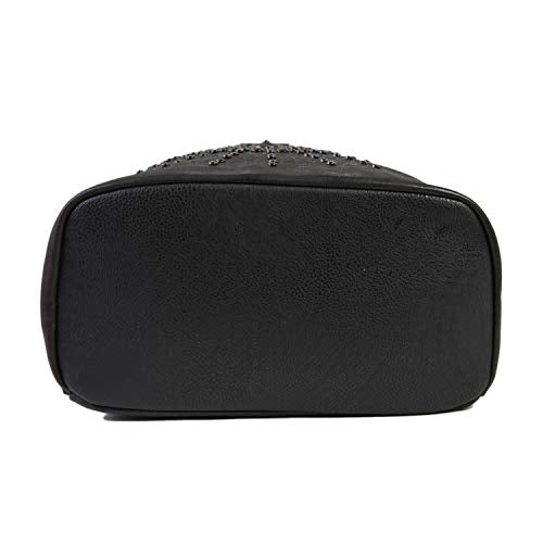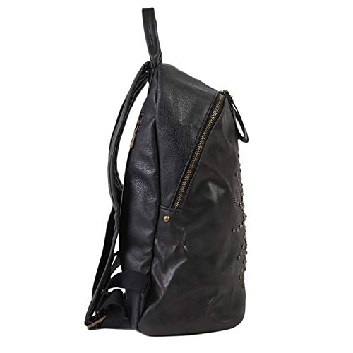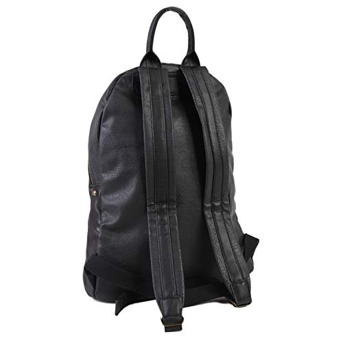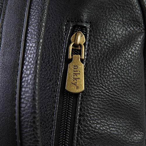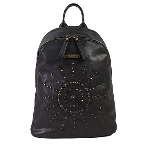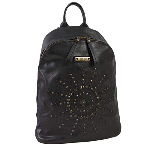Details: Clean, modern and edgy style is what the Nikky soledad backpack gives your look. Exterior Features: Made of eco-leather. Main zipper closure. Eco-leather Zipper pulls. Back zip pocket with Nikky logo zipper pull. Front embossed and studded circle design. Nikky logo nameplate at front. Top 3.5" Handle. Adjustable 25"-32"eco-leather and canvas shoulder straps. Interior Features: Spacious interior lined in signature Nikky nylon print fabric. Two open accessory pockets at front. One zip pocket at back. For cleaning, wipe with damp cloth.