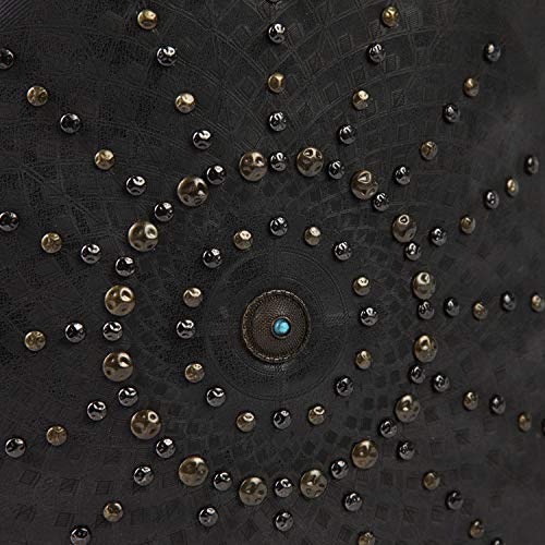 - Front Embossed and studded circle design. Nikky logo nameplate at front. Top 3.5" Handle. Adjustable 25"-32"eco-leather and canvas shoulder straps.