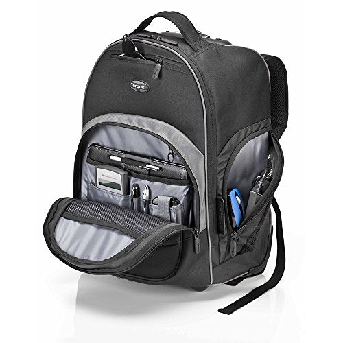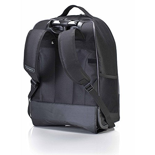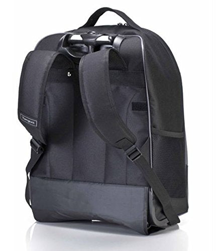 Details: The Targus 16" Compact Rolling Backpack in sleek black goes anywhere you go. Use it as a carry on or a bag for getting around campus – this backpack is functional in every way. Fully equipped with quiet roller wheels and a retractable handle, you’ll be rolling your materials easily and comfortably. Integrated into the main compartment is a soft-lined interior pocket specifically for your media tablet, protecting it from bumps and scratches. The roller backpack has a large compartment for storing books, documents and folders. In a separate section, there is a full workstation where you can store all your accessories, key fobs and pens. For additional storage, there are 2 side mesh pockets – one is zippered for secure storage. Not only is there separate space for your books and tablets, but there are two elastic straps that can hold a change of clothes. Pick up and go when rolling becomes inconvenient – the roller features two shoulder straps for carrying ease that can be tucked away when not in use. The fold away covers acts as wheel covers when used as a backpack. Lightweight and sleek, the Compact Rolling Backpack is 20% lighter than equivalent bags on the market. Dimensions:15.50 inch x 20.00 inch x 3.00 inch (W x H x D), Weight:4.26 Pounds