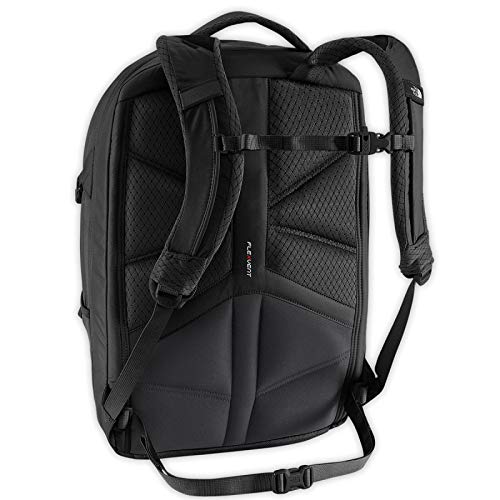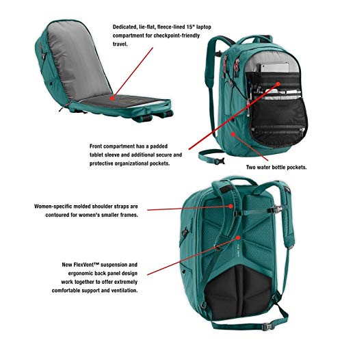 - Fleece-lined tablet sleeve is padded for extra protection. Front pocket with organization panel and zip closure. Elastic water bottle pockets at sides. LED light loop. Embroidered TNF® logo. Adjustable compression straps for load management. Shoulder straps and back panel are specially contoured for female frames. Padded haul handle at top and front of bag. Capacity: 31 liters. 100% nylon. Imported. Measurements: Bottom Width: 14 in Depth: 8 in Height: 19 in Strap Length
