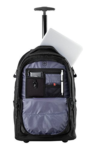 Details: Smooth rolling inline-skate wheels and a trolley make the backpack the perfect travel companion in carry-on size. Rugged and durable nylon construction prepare the backpack for everyday adventure. Air-flow channels in padded back panels keep the wearer cool and comfortable, while the retractable wheel cover protects against dirt. Padded rear compartment with soft, anti-scratch lining holds up to a 16" (41 centimeter) laptop. 10" (25 centimeter) padded portable electronic device pocket with soft, anti-scratch lining for a tablet. Front organizational panel includes full-length zippered pocket, electronics storage pocket, peripherals pocket, mesh ID pocket, pen loop and key fob. Exterior organization includes easy-access front zippered pocket and multi-purpose mesh side pockets ideal for a water bottle or umbrella. Side compression straps cinch bag to stabilize heavy loads. Padded haul handle. 2.26 kg/ 4.98lbs. 30 L/ 1831 cu in.